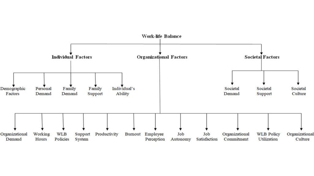 - Demografi: Variasi WLB dipengaruhi oleh usia, jenis kelamin, dan status pernikahan (Powell et al., 2019; Thilagavathy & Geetha, 2020). Misalnya, pasangan karier ganda di keluarga inti mengalami kesulitan lebih besar dalam mengelola pekerjaan dan kehidupan pribadi.